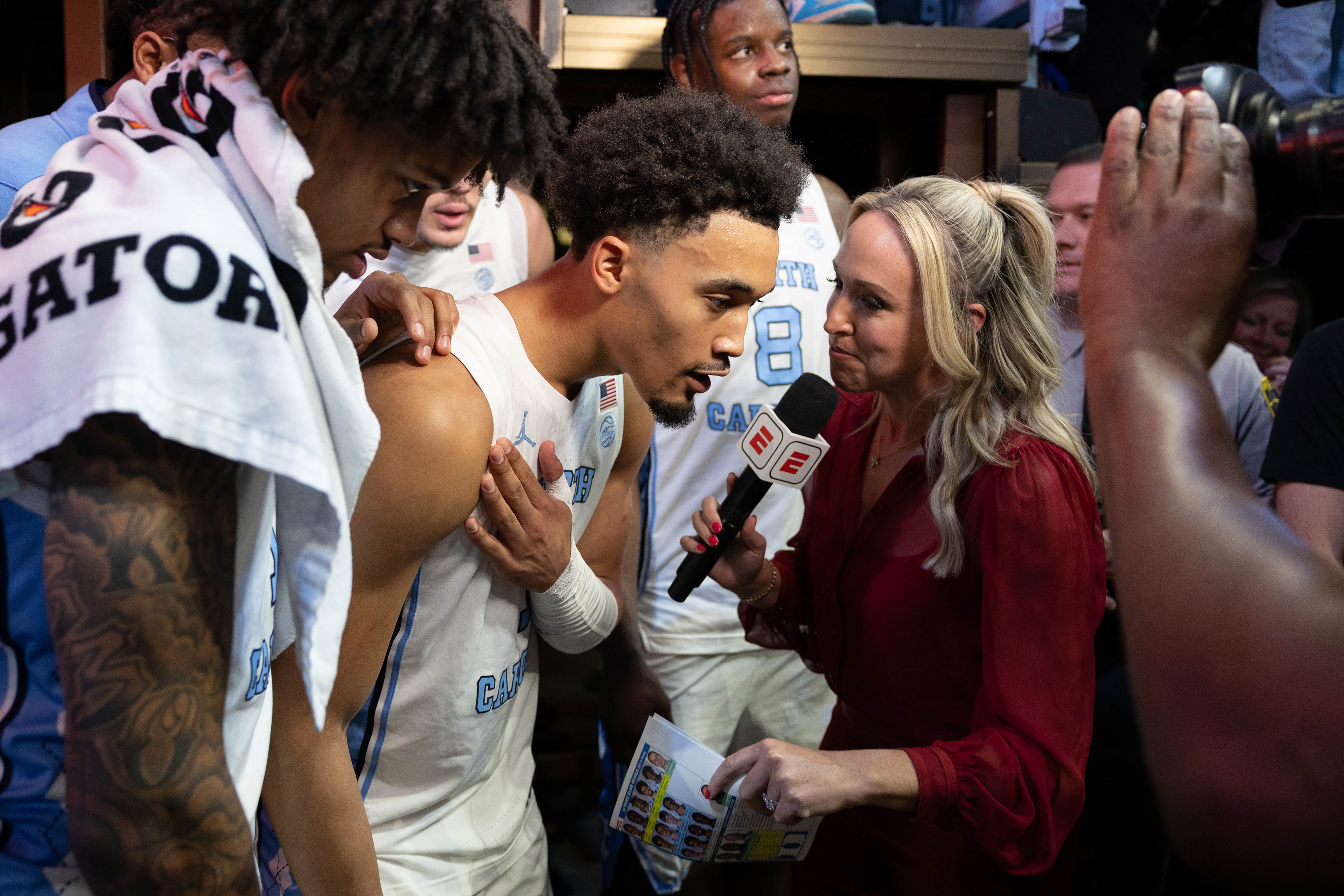 UNC graduate-student forward Jae’Lyn Withers (24) celebrates with his teammates during a post-game interview after the men’s basketball game against Notre Dame during the ACC Tournament on Wedneday, March 12, 2025 at the Spectrum Center. UNC won 76-56.