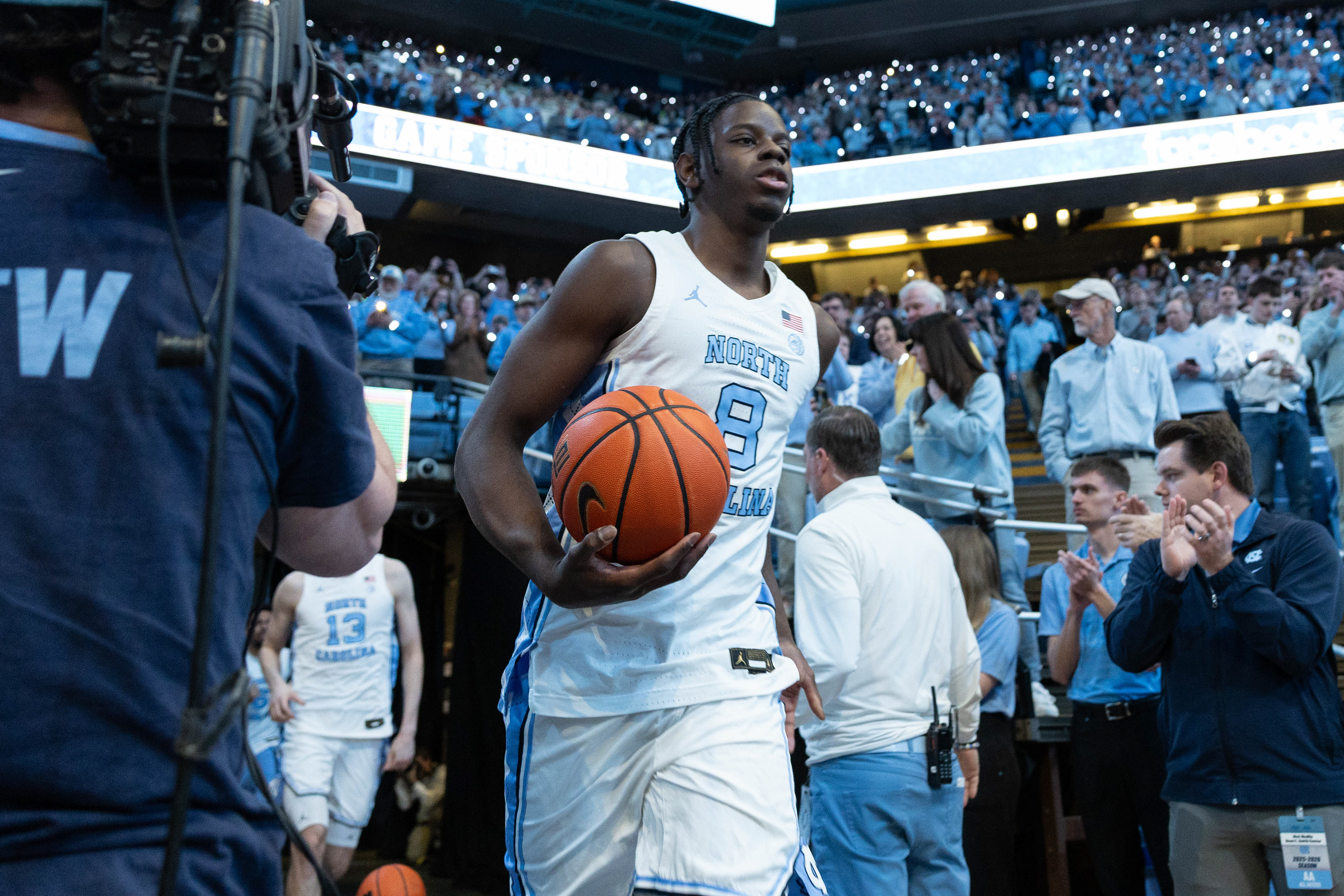 UNC graduate-student guard RJ Davis (4) celebrates with his teammates and family during a pre-game senior night celebration during the men’s basketball game against Duke on Saturday, March 8, 2025 at the Dean Smith Center. UNC lost 82-69.